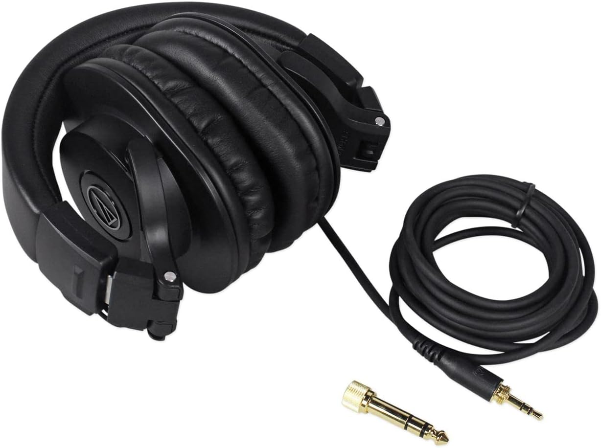 Tuned for enhanced detail, with excellent mid-range definition. Circumaural design contours around the ears for excellent sound isolation in loud environments. Convenient single-side cable exit. Collapsible for space-saving portability. Designed to excel for studio tracking, mixing and field recording. Type: Closed-back dynamic. Driver Diameter: 40 mm. Magnet: Neodymium. Voice Coil: Copper-clad aluminum wire. Frequency Response: 15 - 22,000 Hz. Maximum Input Power: 1,300 mW at 1 kHz. Sensitivity: 96 dB. Impedance: 47 ohms. Weight: 220 g (7.8 oz), without cable and connector. Cable: 3.0 m (9.8'), straight, left-side exit. Accessories Included: Protective carrying pouch, 6.3 mm (1/4) screw-on adapter